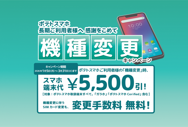 ポテトスマホをご利用いただいている皆様へ機種変更の優待キャンペーンを実施中!【キャンペーン期間:2026年3月31日まで】