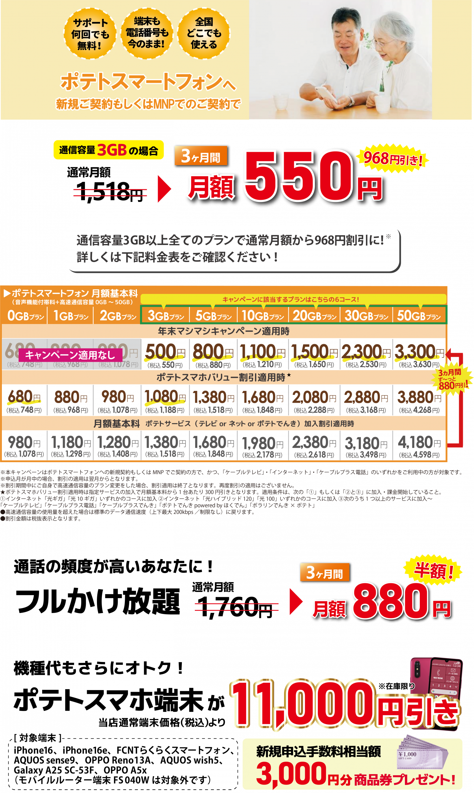 【ポテトスマホ フルかけ放題 月額880円(3ヶ月間)】